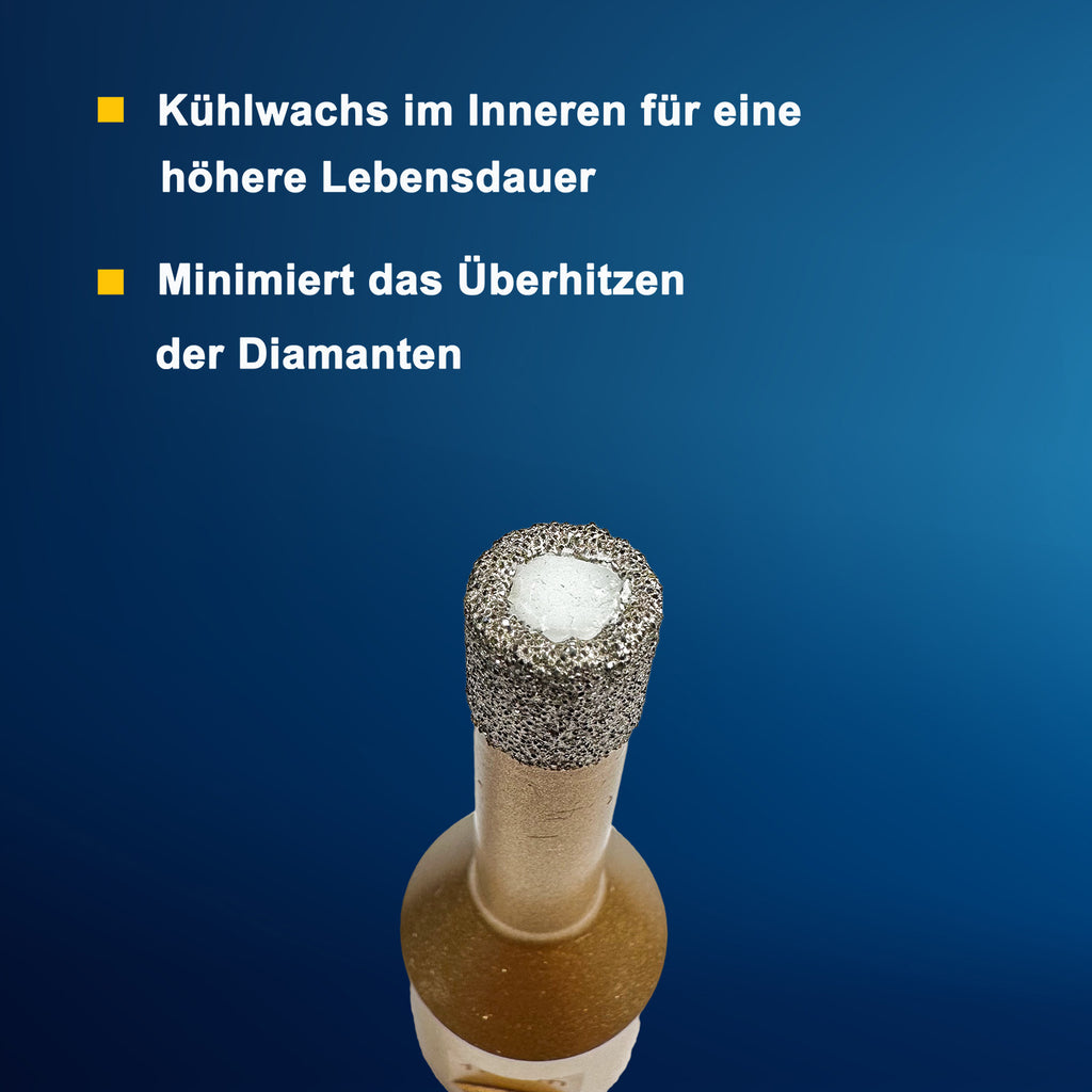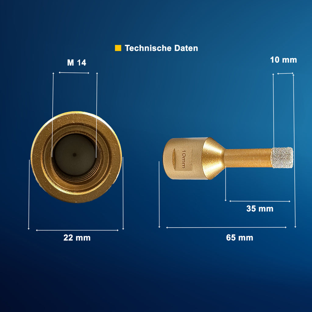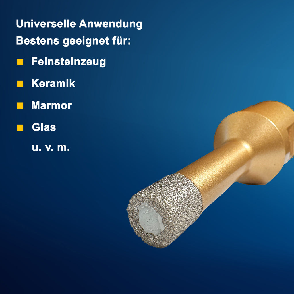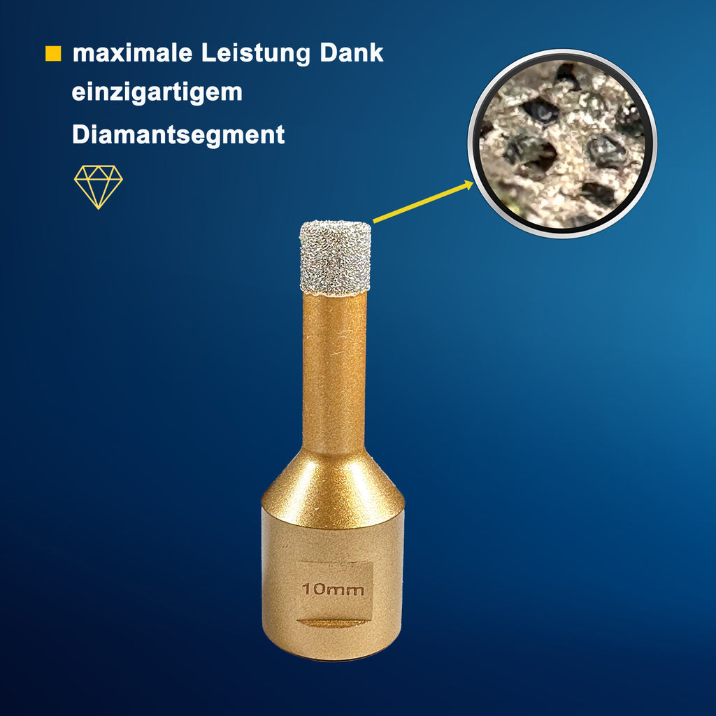 Mit unserem hochwertigen EDW Diamant Fliesenbohrer mit 10 mm Durchmesser und 35 mm Nutzlänge können Sie extrem schnell, sauber und präzise Bohrlöcher in Fliesen, Feinsteinzeug, Keramik, Natursteinfliesen, glasierte Klinker, Glas harte Dachziegel und Bodenfliesen platzieren. Durch die sehr hohe Drehzahl ist ein rasanter Bohrvorgang möglich und Bohrlöcher werden leicht, fast wie von selbst, punktgenau geschnitten. Der sorgfältig gewählte Industriediamant lässt diese EDW Fliesen- Bohrkrone ein Spezialist in Sachen Fliesenbohrtechnik sein. Der Fliesenbohrer mit 8mm Durchmesser setzt sich in harten Fliesen oder Feinsteinzeug ebenso durch, wie bei ansatzweise spröden Materialien. Für die Verwendung mit Winkelschleifern und Bohrmaschinen mit einer M14 Aufnahme wie z.B. von Makita, Bosch, Metabo, Einhell, Festool, Parkside & weitere geeignet. Der EDW Fliesenbohrer erspart Ihnen unnötige Investitionen in ständig zu Bruch gehendes Fliesenmaterial oder Feinsteinzeug. Schnelligkeit und Maßgenauigkeit sind ohne Verkanten und Verhaken garantiert. Trotz ihrer Leistungsfähigkeit ist eine lange Lebensdauer der Bohrkrone gewährleistet. EDW Feinsteinzeugbohrer schräg auf dem Materialien ansetzen – anschließend etwas eintauchen und direkt danach gerade ausrichten. So entstehen akkurate Bohrlöcher ohne großen Kraftaufwand und in kürzester Zeit. Unser 6mm Diamantbohrer ist auch in anderen Größen erhältlich. Somit bekommen Sie unsere Bohrkrone / Diamant Bohrkrone in 6mm, 10mm, 14mm bis zu 68mm. Dieses Fliesen Werkzeug ist schnell, präzise, effektiv und professionell!