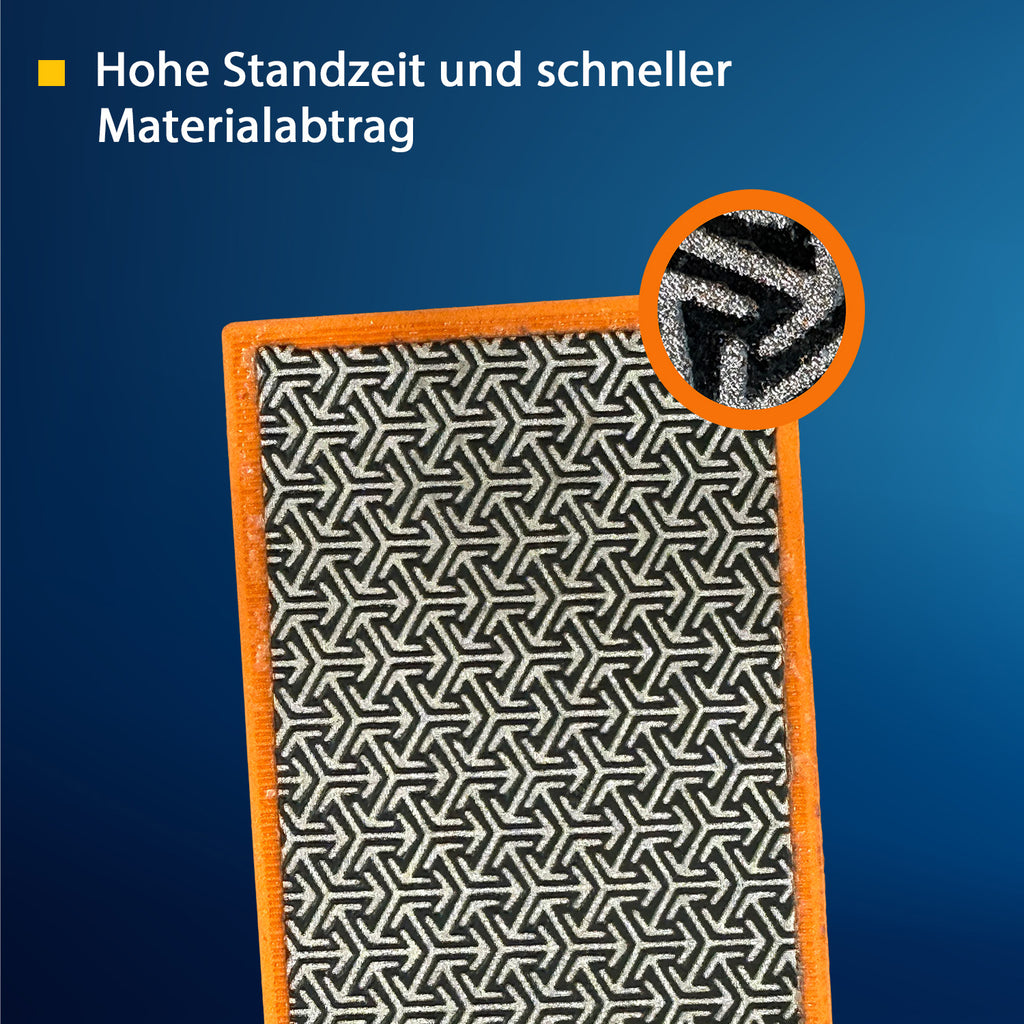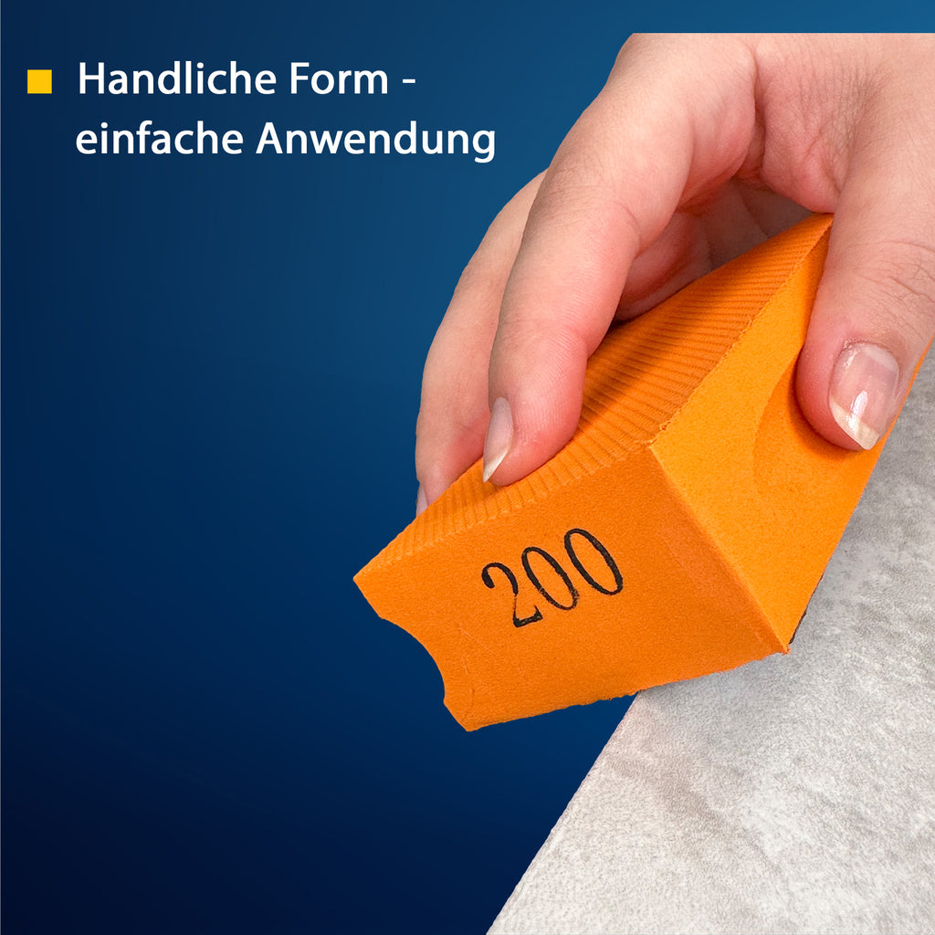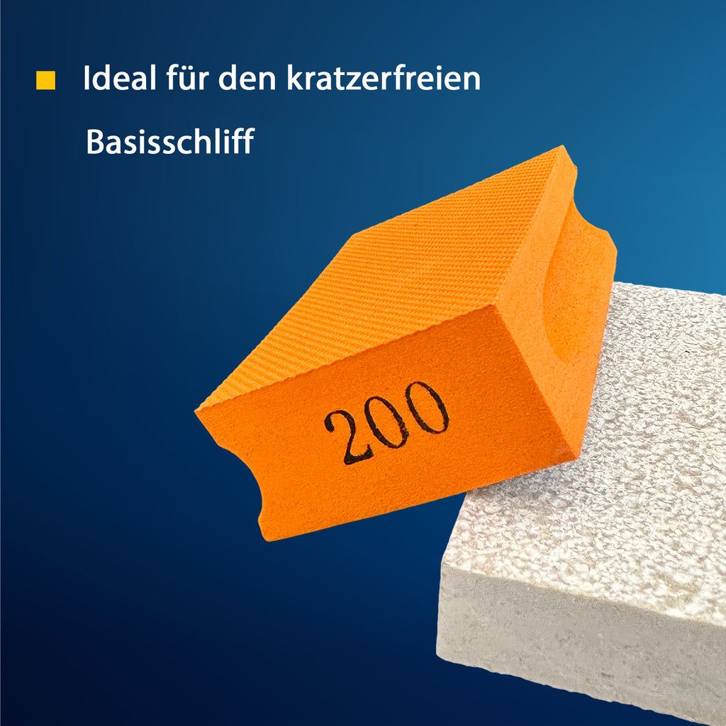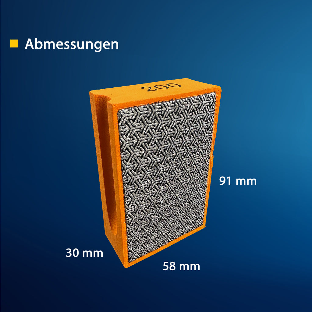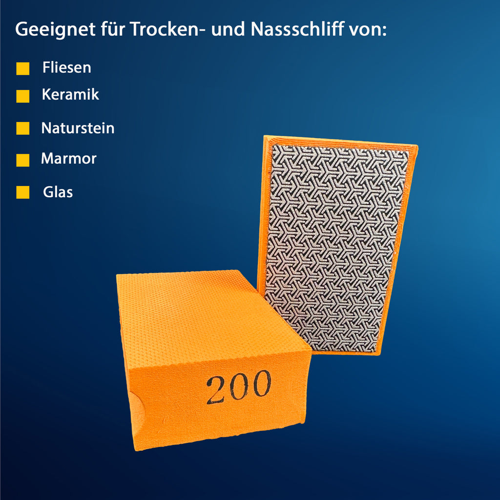 Unsere EDW Profi-Diamanthandschleifpads, Schleifschwämme sind für Trocken- und Nassschliff geeignet, galvanisch gebunden und verfügen über eine 200er Körnung. Die ergonomische Form des Schleifschwammes lässt ihn optimal in der Hand liegen. Das Handschleifpad eignet sich zum schleifen, polieren und entgraten verschiedenster Oberflächen und Materialien. Optimal geeignet für Naturstein- und Glaskanten, Granit, Natur- und Kunststein, Marmor, Fliesen, Feinsteinzeug