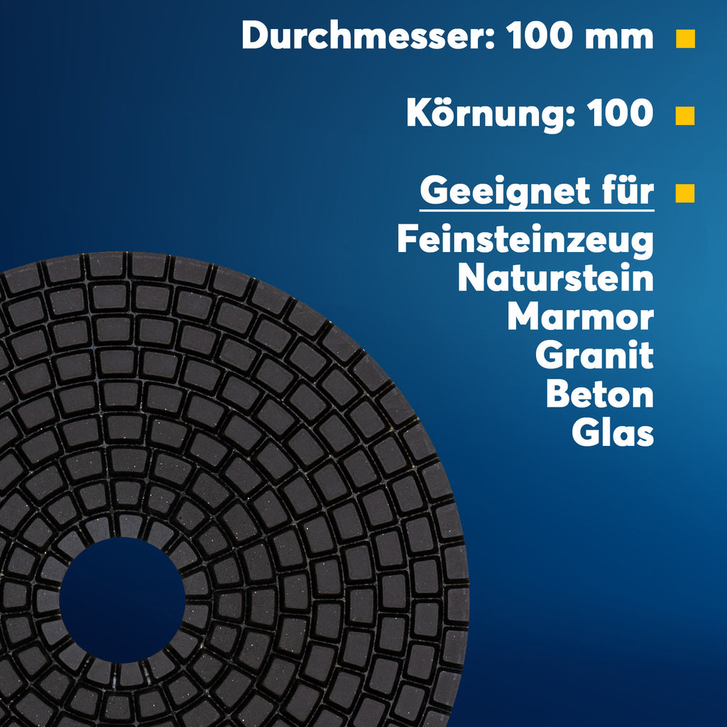 Hochwertiges EDW Premium Diamant-Schleifpad Nass Ø 100 mm mit sehr strapazierfähiger und haltbarer Klettaufnahme. Das Schleifpad ist bestens geeignet für die Bearbeitung von Fliesen, Feinsteinzeug, Keramik, Naturstein, Granit, Glas und Marmor. Ob Fensterbänke, Treppenstufen oder Arbeitsplatten – Kanten, Fasen oder Flächen - mit dem sehr haltbaren und strapazierfähigen Schleifpad erzielen Sie hervorragende Ergebnisse. Zur Verwendung mit Winkel-, Schwing- und Exenterschleifer. Diamantwerkzeuge von EDW werden mit hochwertigen Industriediamanten in kunstharzgebundener Wabenstruktur mit sehr hoher Diamantkonzentration hochwertig verarbeitet und hergestellt, die hohen Ansprüchen in den angegebenen Materialien standhalten.