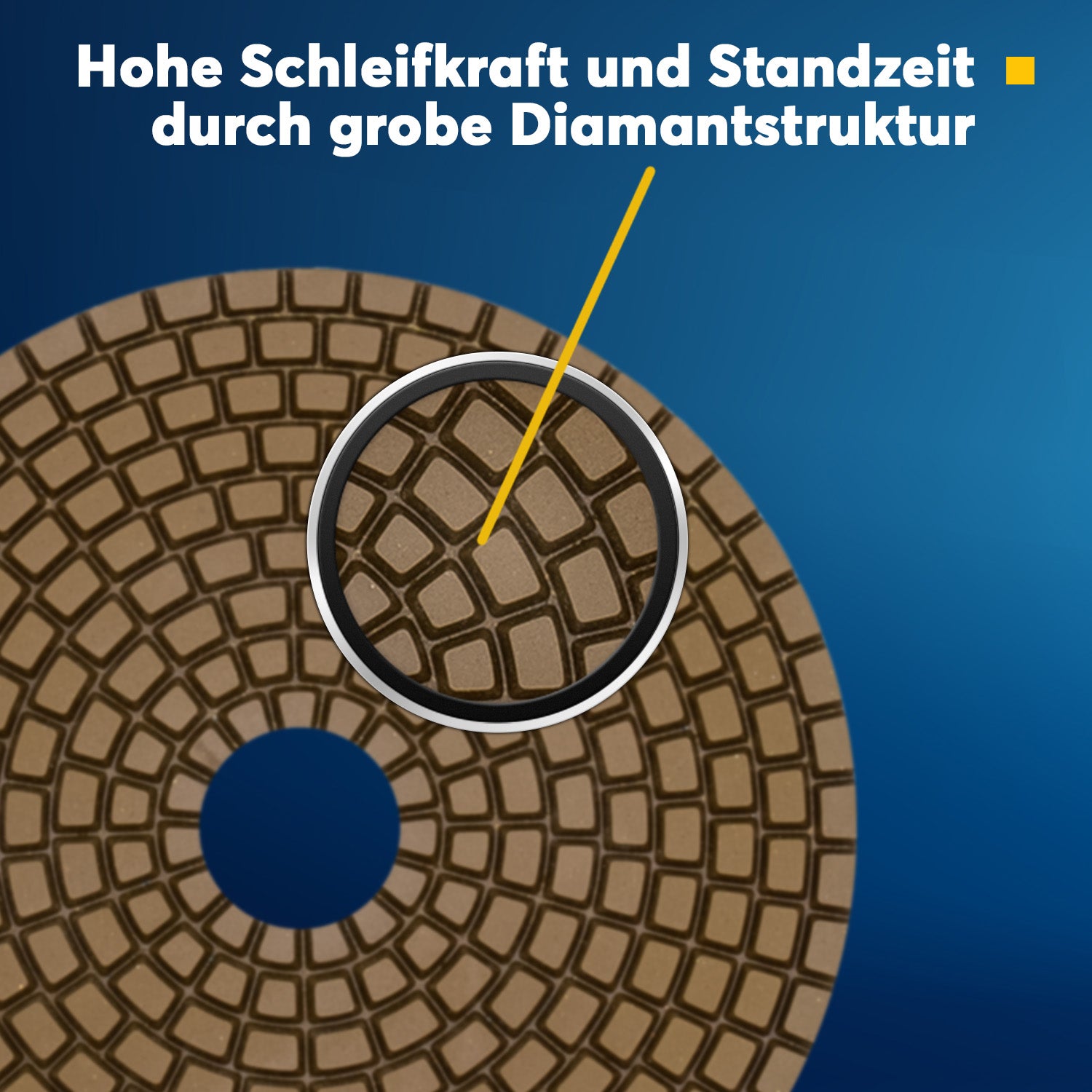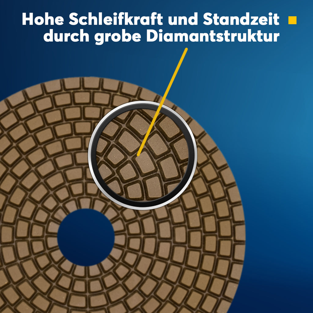 Hier eine Übersicht über die Eigenschaften unserer Diamant-Schleifpads