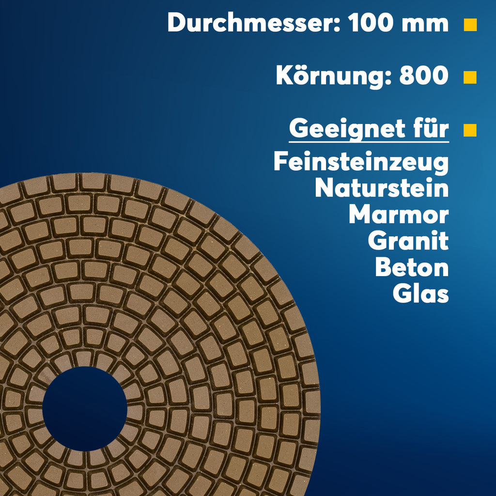 Hochwertiges EDW Premium Diamant-Schleifpad Nass Ø 100 mm mit sehr strapazierfähiger und haltbarer Klettaufnahme. Das Schleifpad ist bestens geeignet für die Bearbeitung von Fliesen, Feinsteinzeug, Keramik, Naturstein, Granit, Glas und Marmor. Ob Fensterbänke, Treppenstufen oder Arbeitsplatten – Kanten, Fasen oder Flächen - mit dem sehr haltbaren und strapazierfähigen Schleifpad erzielen Sie hervorragende Ergebnisse. Zur Verwendung mit Winkel-, Schwing- und Exenterschleifer. Diamantwerkzeuge von EDW werden mit hochwertigen Industriediamanten in kunstharzgebundener Wabenstruktur mit sehr hoher Diamantkonzentration hochwertig verarbeitet und hergestellt, die hohen Ansprüchen in den angegebenen Materialien standhalten.