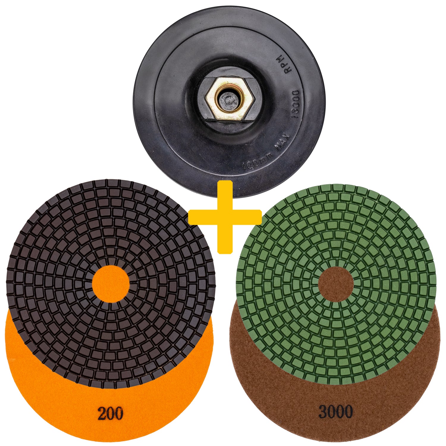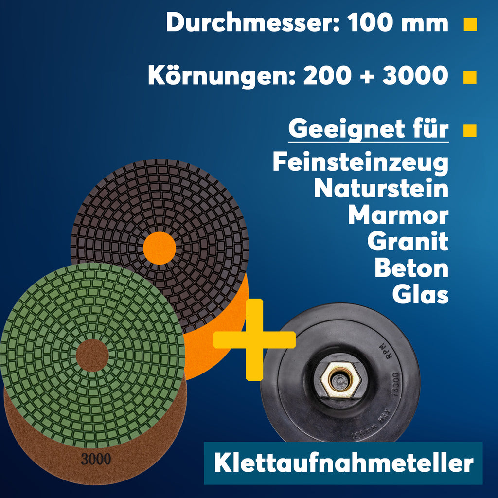 Unser EDW Diamant-Nass-Schleifpad-Set Körnung 200, 3000 und Klett-Aufnahmeteller ist ideal für den kratzerfreien Basis-Schliff und die erweiterte Hochglanzpolitur geeignet