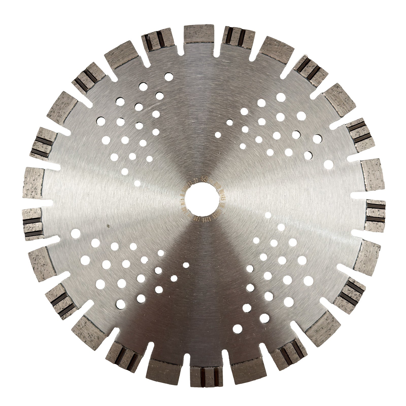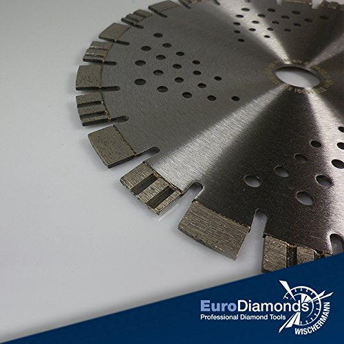 Unsere EDW Profi-Diamanttrennscheibe SUPERCUTTER ist mit Turbokurzzahnsegmentierung ausgestattet. Diese Zahnsegmente versprechen einen schnellen und sauberen Schnitt. Die Kühlbohrungen der Diamanttrennscheibe verringern die Kühlzeit bei Gebrauch. Hierdurch ergibt sich eine sehr hohe Standzeit der Trennscheibe. Geeignet ist die Profi-Diamanttrennscheibe SUPERCUTTER für jede handelsübliche Handmaschine. Optimal geeignet für Stahlbeton, Granit, Naturstein, Basalt, Kalksandstein, Klinker, Kunststein, Waschbeton