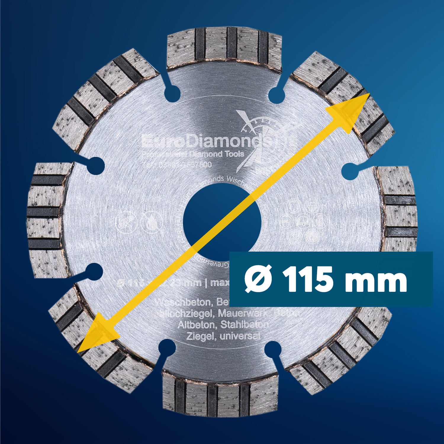 Unsere 115 mm Trennscheibe mit einer Belagshöhe von 10mm und einer Segmentbreite von 2,3 mm passt durch ihre mittlere Aufnahmebohrung von 22,2 mm auf alle gängigen Winkelschleifer und Handmaschinen von Bosch, Makita, Festool, Flex Metabo und vielen mehr. Sie ist sowohl für Trockenschnitte als auch Nass-Schnitte bestens geeignet und nach DIN 13236 gefertigt.