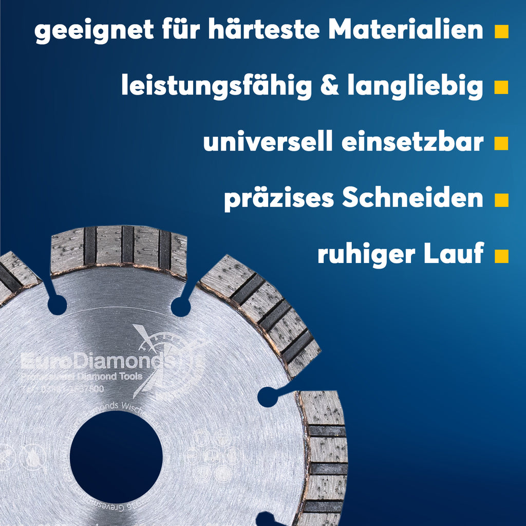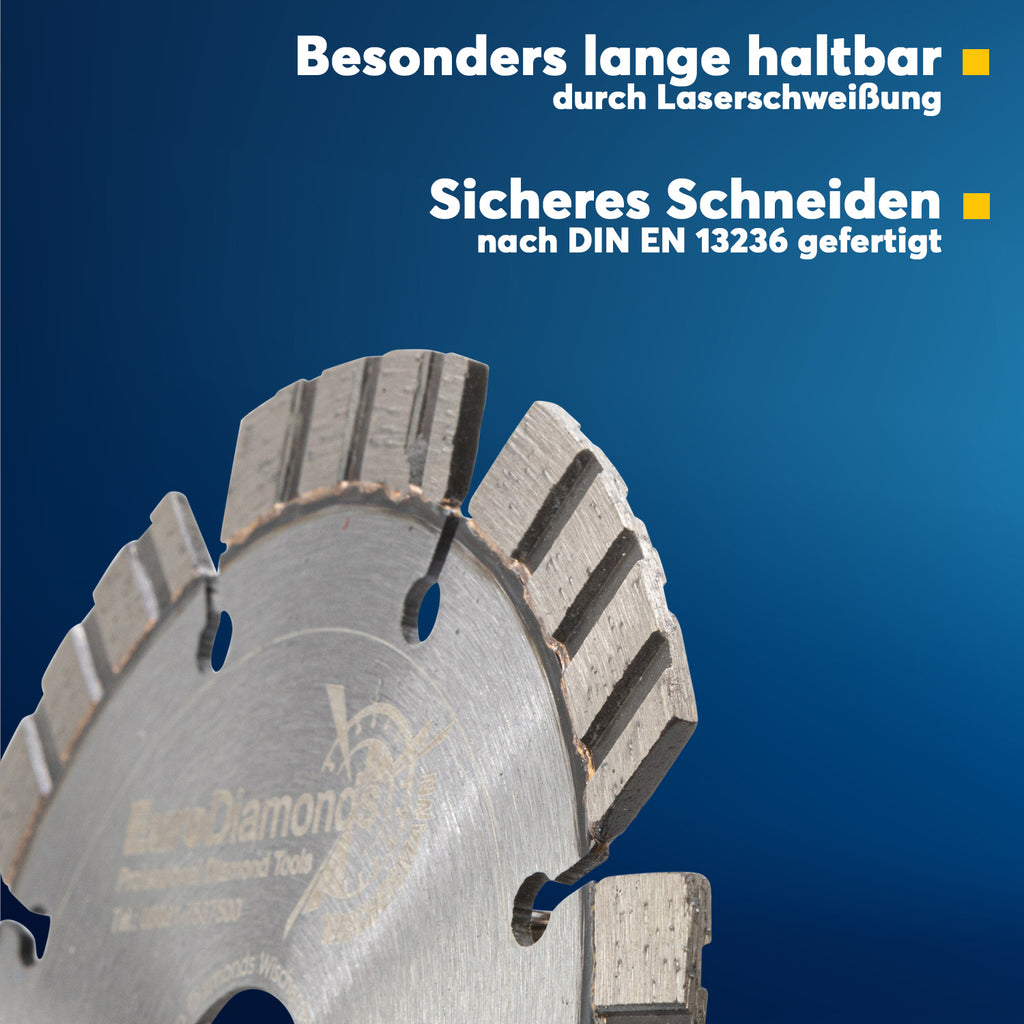 Vertrauen Sie auf die Qualität und Zuverlässigkeit unserer Premium Laser Turbo Diamant-Trennscheibe und erleichtern Sie sich die Arbeit auf wechselnden Baustellenmaterialien. Setzen Sie auf Profi-Qualität, um Ihr Projekt erfolgreich abzuschließen.