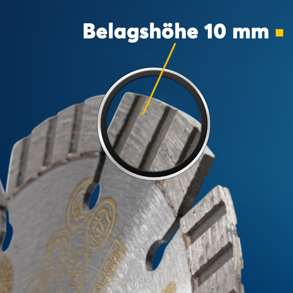Unsere Diamant-Trennscheibe Premium Laser-Turbo 115 ist ein hochwertiges und robustes Werkzeug, konzipiert für Handwerker, Bauunternehmer und Dienstleister. Dank ihrer speziell ausgewählten sehr groben Diamantstruktur und ihrer lasergeschweißten Turbosegmentierung ist sie speziell für härteste Materialien wie Stahlbeton oder hoch armierten Beton bestens geeignet. In Verbindung mit einem robusten Stahlkern erzielt sie nicht nur eine enorme Laufruhe und Stabilität, sondern auch eine herausragende Standzeit, bei wechselnden Baustellenmaterialien. Die Trennscheibe ist optimal geeignet für Arbeiten mit hoher Beanspruchung und für eine Vielzahl von Baustoffen wie: